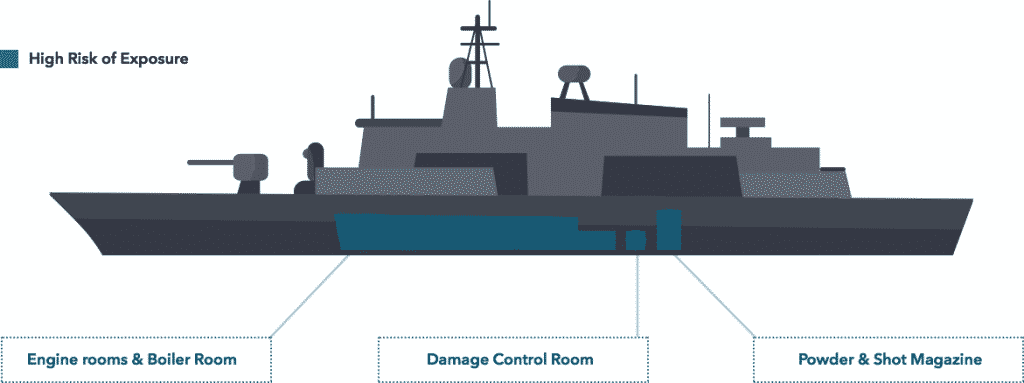 Sailors who worked in these areas had the most exposure to asbestos. This is due to the asbestos content, as well as poor ventilation in the below-deck areas, which led to workers inhaling a high number of asbestos fibers.[4]